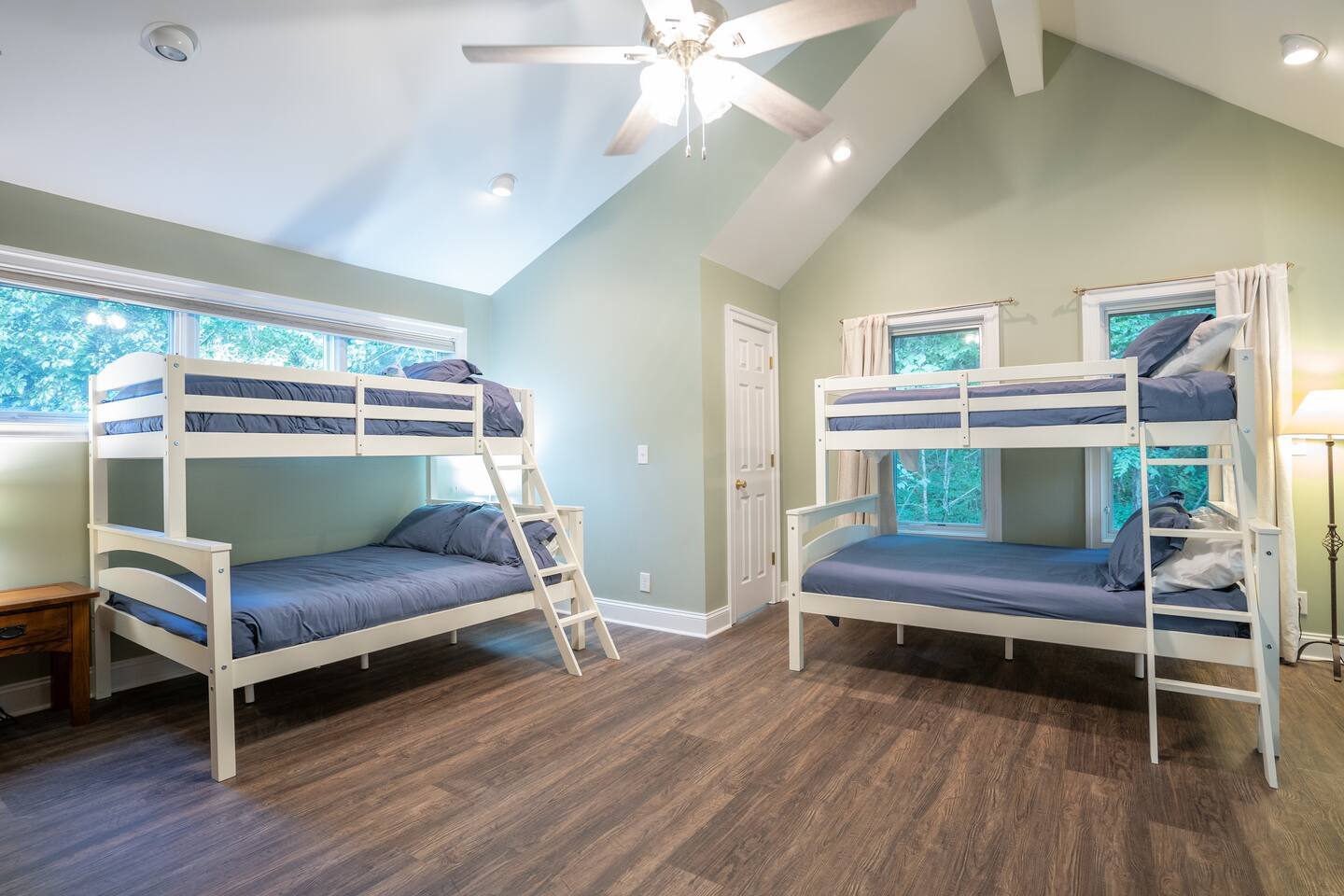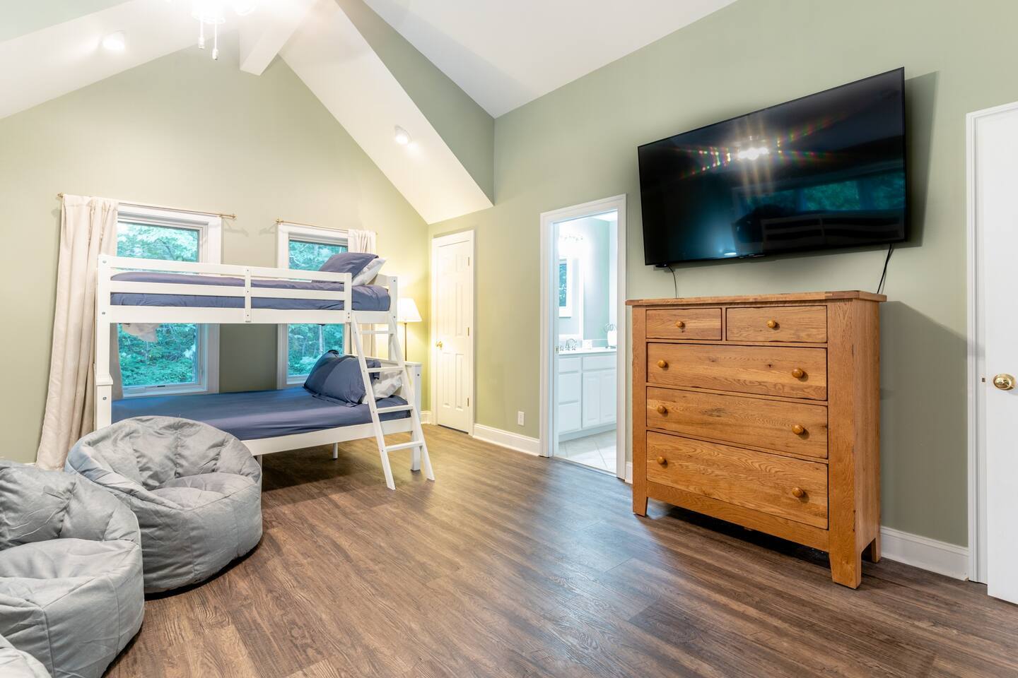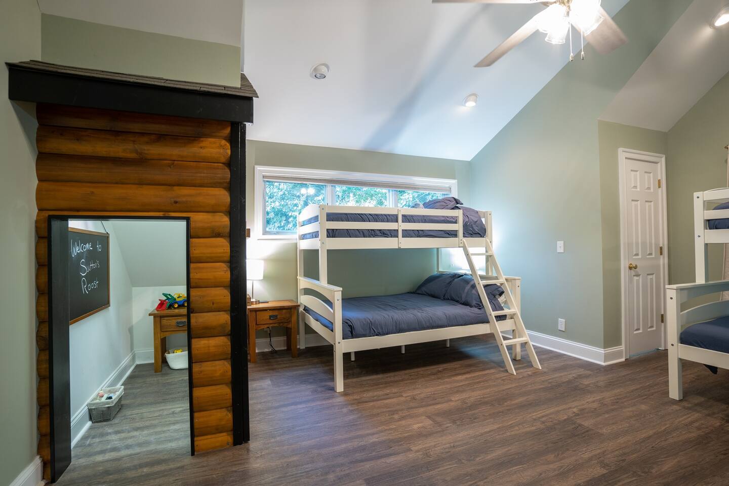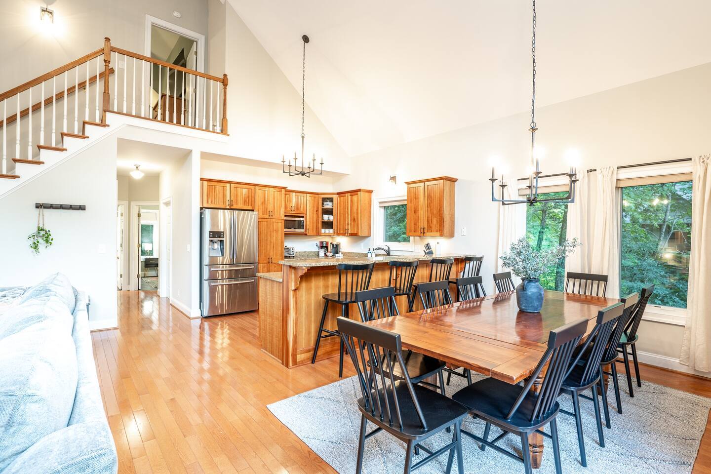 The house is about a 3 minute drive to the slopes, dining, and everything else Wintergreen has to offer. There's also a fantastic hiking trail with a gorgeous overlook just a few doors down from the house. If you’re willing to venture a bit further, some of the best hiking trails in the state are off the Blue Ridge Parkway (15 minutes from the cabin), two sandy-beach-entrance lakes plus a community pool for swimming, and over dozen wineries, breweries, and distilleries within a 30 minute drive. The home layout is as follows: Main level: - Great room with ample seating and working gas log fireplace (super simple to operate) - Kitchen with gas range and everything you need to prepare large meals, and bar seating for 4 - Dining area with table for 10 - BR1: Master bedroom, king bed, ensuite full bathroom - BR2: King bed - Full bathroom in hallway - Upper deck with table seating for 10, propane grill, and lounge area around propane fire table Lower level: - Additional living room / game room with shuffleboard table, arcade game, 65" TV, and sofa that converts to full bed - BR3: King bed - BR4: Two queens, plus kitchenette with mini-fridge, microwave and Keurig - Full bathroom in hallway - Lower screened-in deck with hot tub, 3-person cedar sauna, and sitting area - Pet-door access from lower deck to fenced-in side yard - Utility room with washer / dryer and an additional full-size refrigerator Upper level: - BR5: Master bedroom with 2 bunk bed sets (twin over full), 4 closets (3 are themed for kids, including a custom log-cabin closet), and ensuite full bathroom Accessibility: - The distance from the parking area to the front door is 28 steps. - You must go up 5 steps to get into the lower level entrance from the driveway - No bedrooms are accessible without using steps. - No grab bars by the toilet or bath. - Hot tub and sauna are located on the ground floor - There is navigating room for a wheelchair - The main entrance is wider than 32 inches.