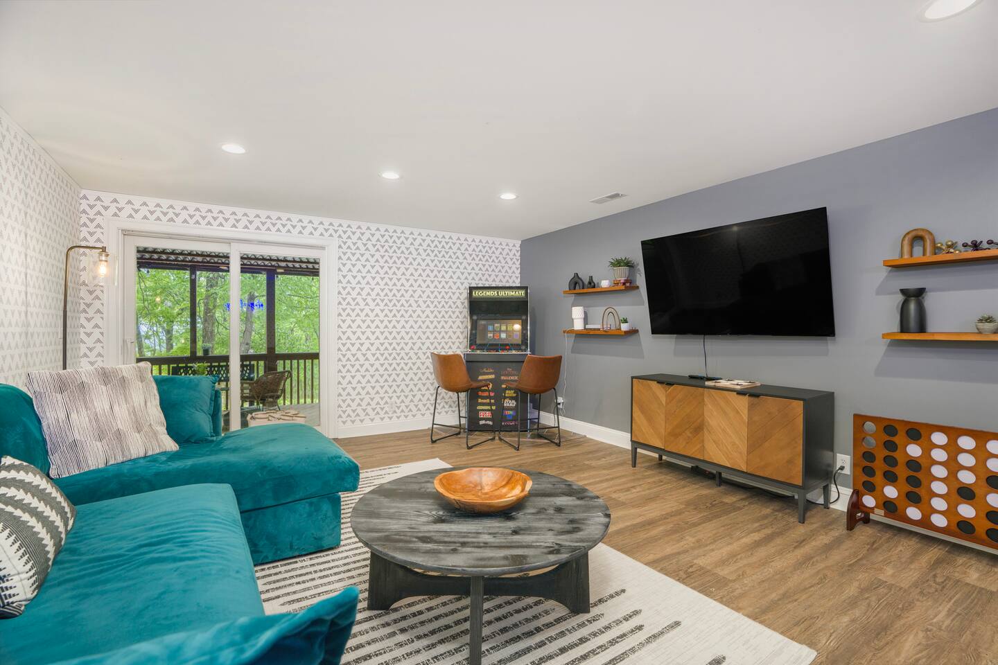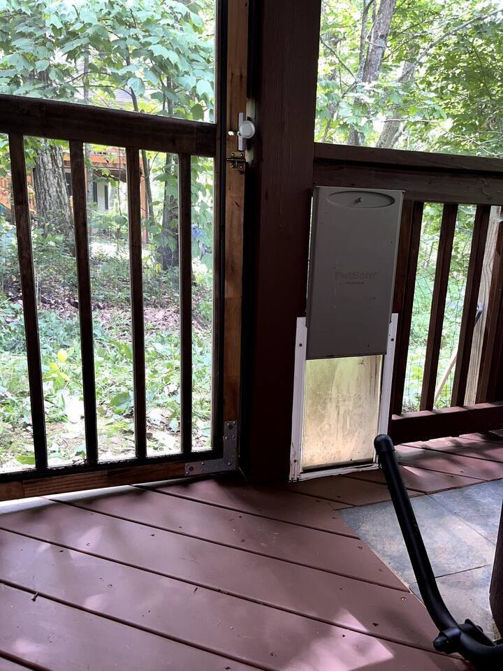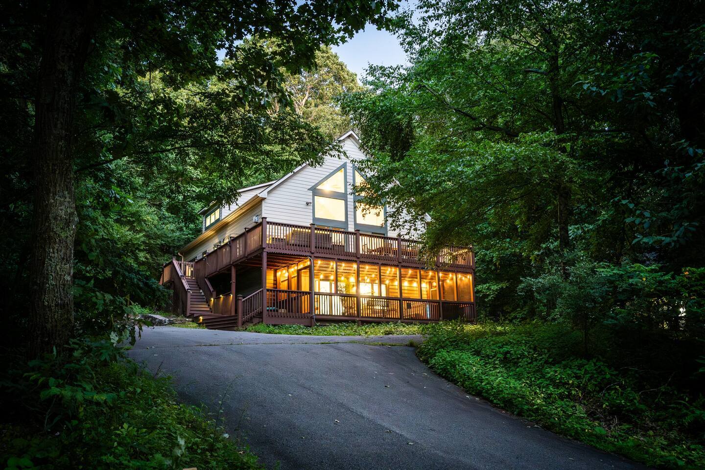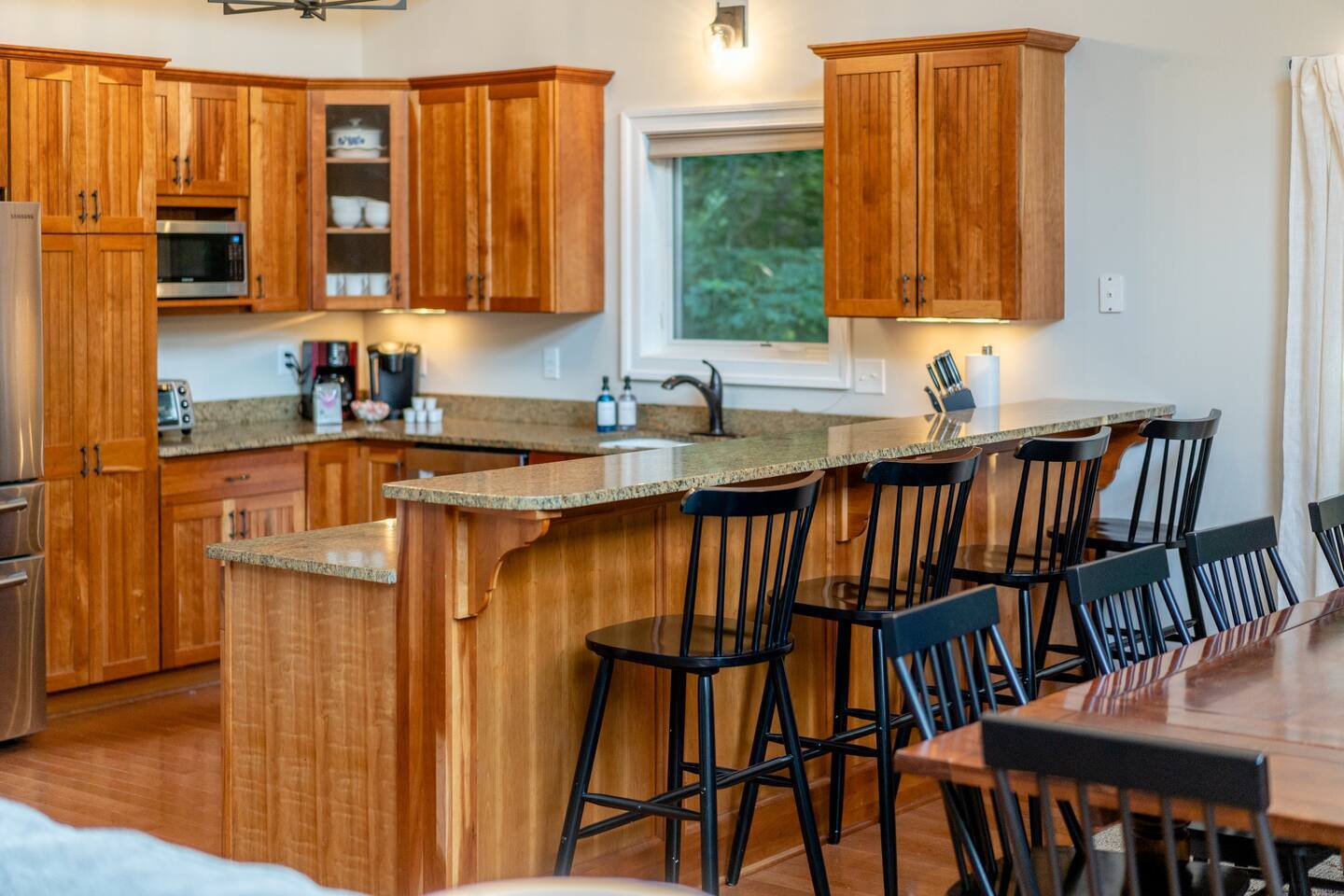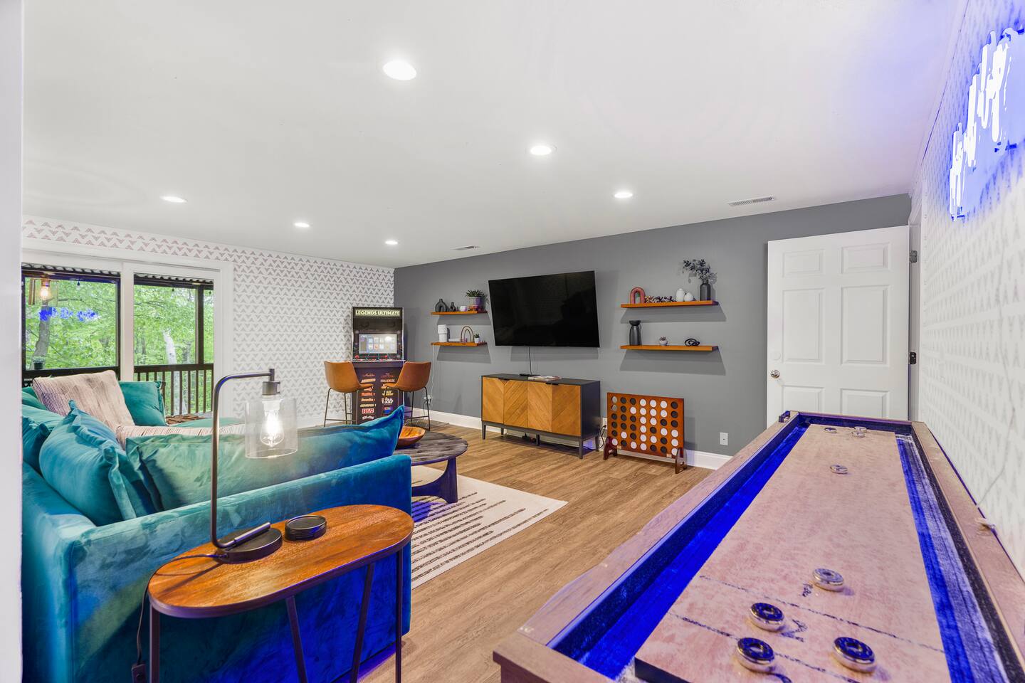 The house is about a 3 minute drive to the slopes, dining, and everything else Wintergreen has to offer. There's also a fantastic hiking trail with a gorgeous overlook just a few doors down from the house. If you’re willing to venture a bit further, some of the best hiking trails in the state are off the Blue Ridge Parkway (15 minutes from the cabin), two sandy-beach-entrance lakes plus a community pool for swimming, and over dozen wineries, breweries, and distilleries within a 30 minute drive. The home layout is as follows: Main level: - Great room with ample seating and working gas log fireplace (super simple to operate) - Kitchen with gas range and everything you need to prepare large meals, and bar seating for 4 - Dining area with table for 10 - BR1: Master bedroom, king bed, ensuite full bathroom - BR2: King bed - Full bathroom in hallway - Upper deck with table seating for 10, propane grill, and lounge area around propane fire table Lower level: - Additional living room / game room with shuffleboard table, arcade game, 65" TV, and sofa that converts to full bed - BR3: King bed - BR4: Two queens, plus kitchenette with mini-fridge, microwave and Keurig - Full bathroom in hallway - Lower screened-in deck with hot tub, 3-person cedar sauna, and sitting area - Pet-door access from lower deck to fenced-in side yard - Utility room with washer / dryer and an additional full-size refrigerator Upper level: - BR5: Master bedroom with 2 bunk bed sets (twin over full), 4 closets (3 are themed for kids, including a custom log-cabin closet), and ensuite full bathroom Accessibility: - The distance from the parking area to the front door is 28 steps. - You must go up 5 steps to get into the lower level entrance from the driveway - No bedrooms are accessible without using steps. - No grab bars by the toilet or bath. - Hot tub and sauna are located on the ground floor - There is navigating room for a wheelchair - The main entrance is wider than 32 inches.
