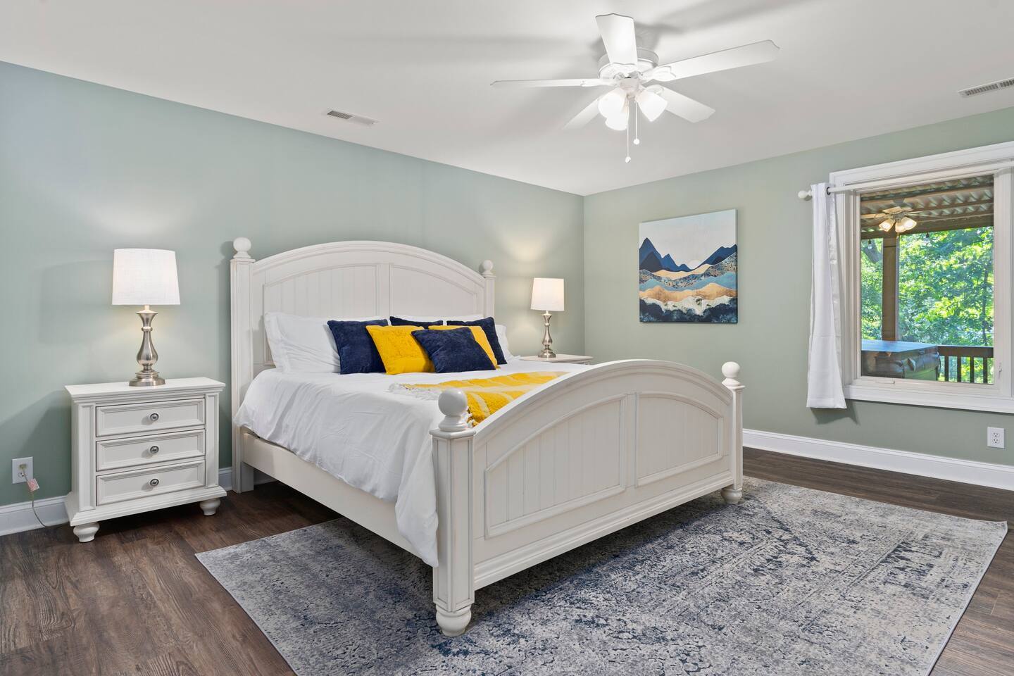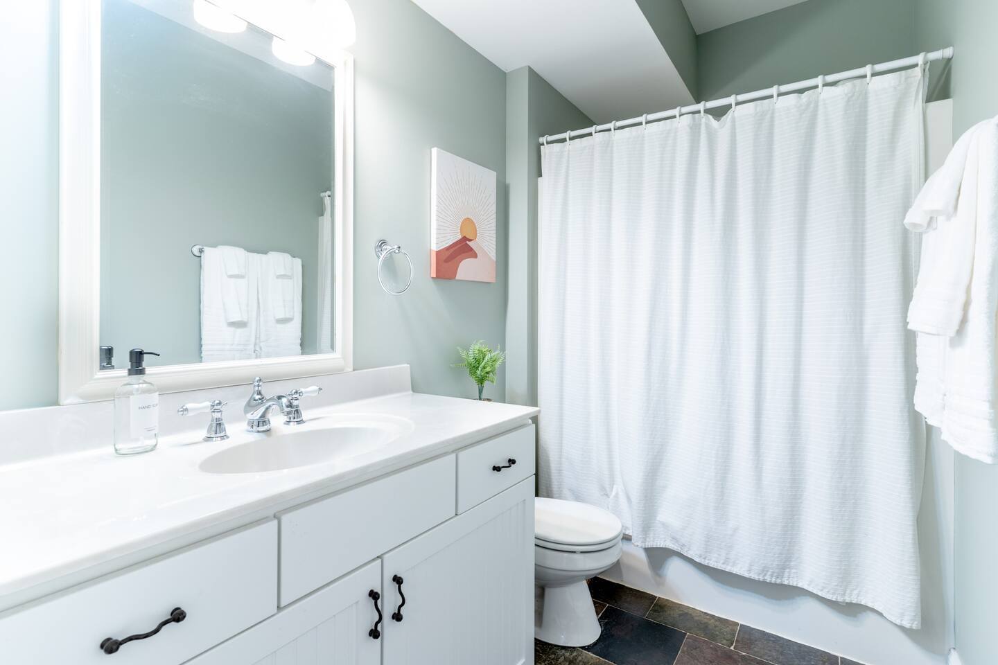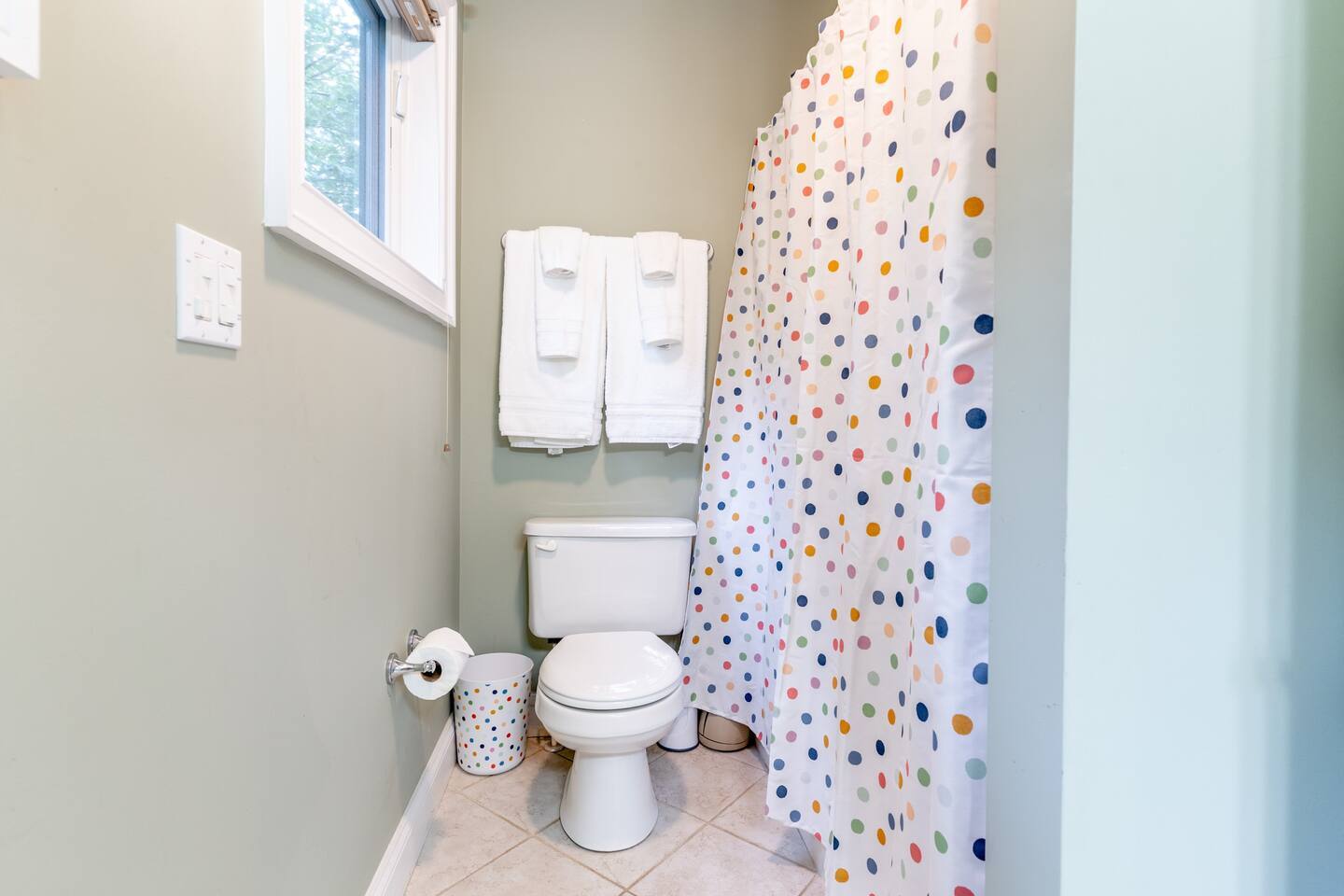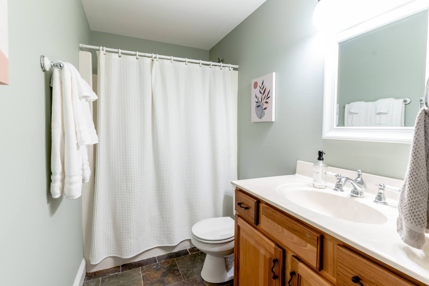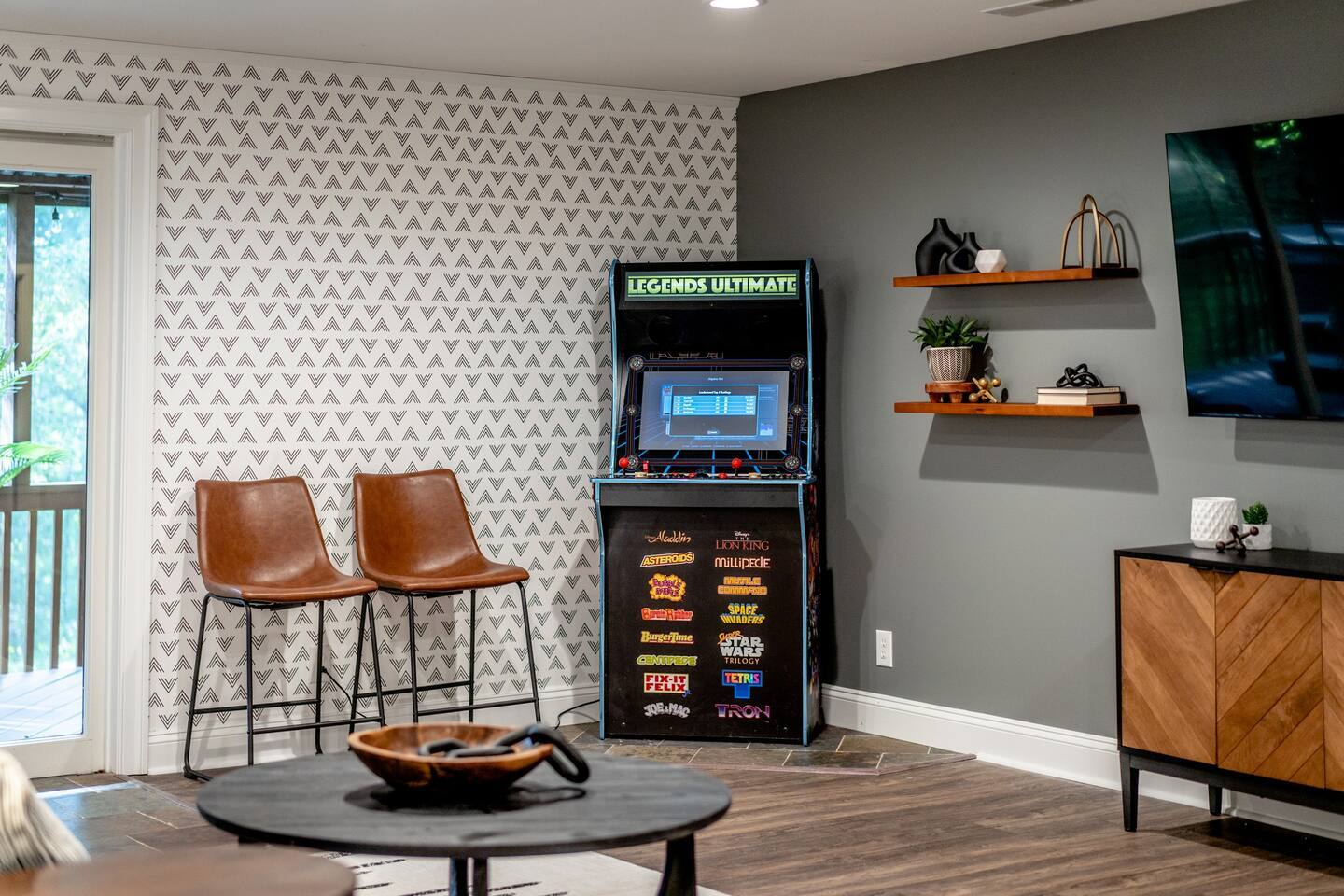 The house is about a 3 minute drive to the slopes, dining, and everything else Wintergreen has to offer. There's also a fantastic hiking trail with a gorgeous overlook just a few doors down from the house. If you’re willing to venture a bit further, some of the best hiking trails in the state are off the Blue Ridge Parkway (15 minutes from the cabin), two sandy-beach-entrance lakes plus a community pool for swimming, and over dozen wineries, breweries, and distilleries within a 30 minute drive. The home layout is as follows: Main level: - Great room with ample seating and working gas log fireplace (super simple to operate) - Kitchen with gas range and everything you need to prepare large meals, and bar seating for 4 - Dining area with table for 10 - BR1: Master bedroom, king bed, ensuite full bathroom - BR2: King bed - Full bathroom in hallway - Upper deck with table seating for 10, propane grill, and lounge area around propane fire table Lower level: - Additional living room / game room with shuffleboard table, arcade game, 65" TV, and sofa that converts to full bed - BR3: King bed - BR4: Two queens, plus kitchenette with mini-fridge, microwave and Keurig - Full bathroom in hallway - Lower screened-in deck with hot tub, 3-person cedar sauna, and sitting area - Pet-door access from lower deck to fenced-in side yard - Utility room with washer / dryer and an additional full-size refrigerator Upper level: - BR5: Master bedroom with 2 bunk bed sets (twin over full), 4 closets (3 are themed for kids, including a custom log-cabin closet), and ensuite full bathroom Accessibility: - The distance from the parking area to the front door is 28 steps. - You must go up 5 steps to get into the lower level entrance from the driveway - No bedrooms are accessible without using steps. - No grab bars by the toilet or bath. - Hot tub and sauna are located on the ground floor - There is navigating room for a wheelchair - The main entrance is wider than 32 inches.