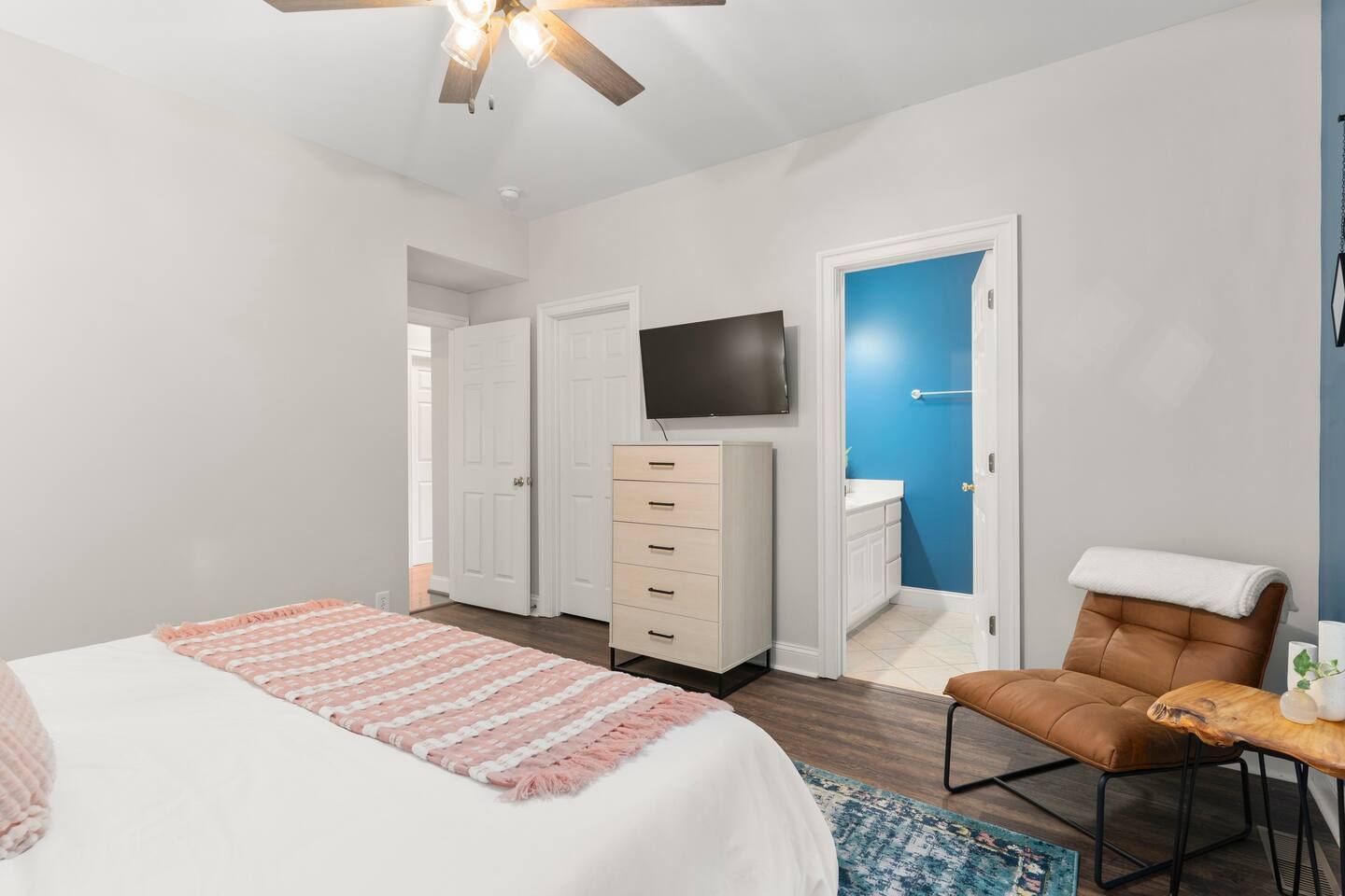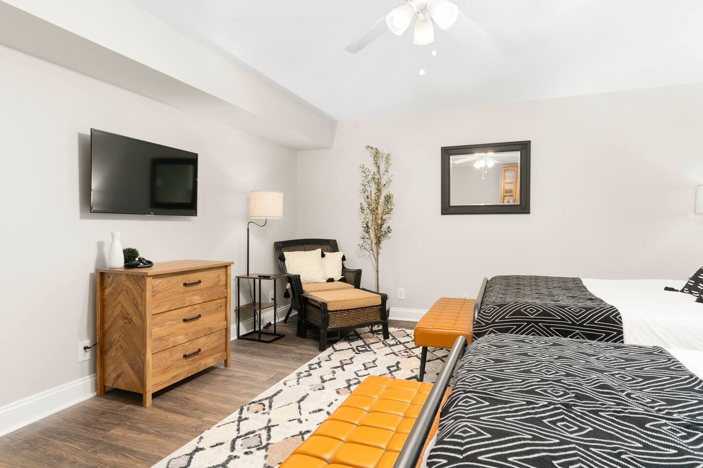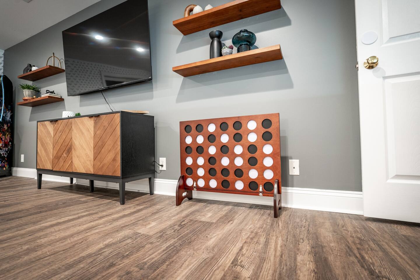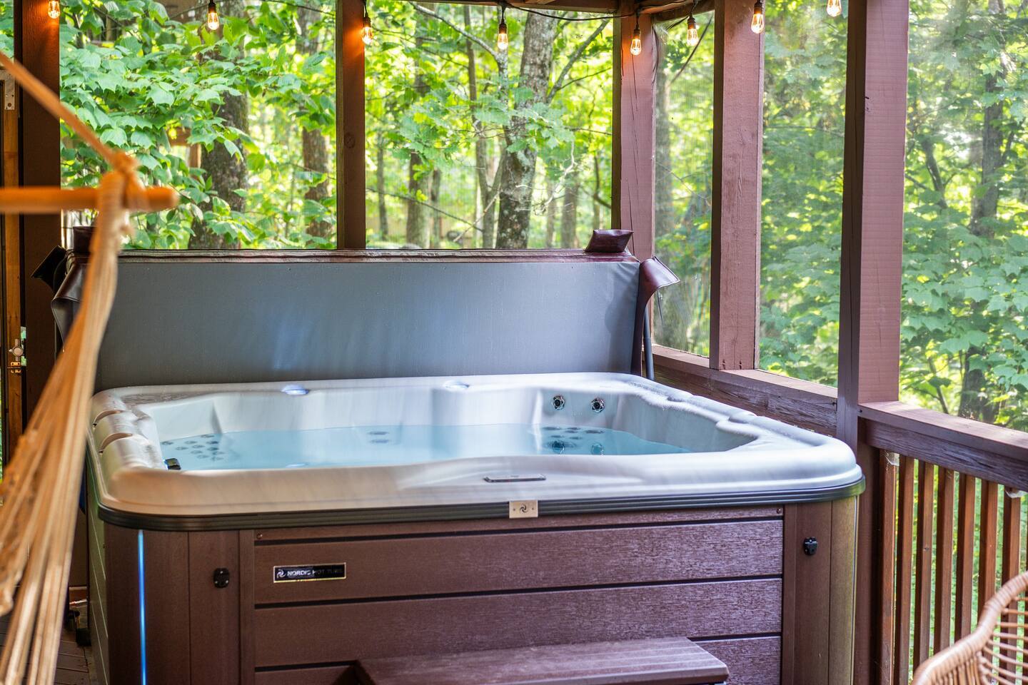 The house is about a 3 minute drive to the slopes, dining, and everything else Wintergreen has to offer. There's also a fantastic hiking trail with a gorgeous overlook just a few doors down from the house. If you’re willing to venture a bit further, some of the best hiking trails in the state are off the Blue Ridge Parkway (15 minutes from the cabin), two sandy-beach-entrance lakes plus a community pool for swimming, and over dozen wineries, breweries, and distilleries within a 30 minute drive. The home layout is as follows: Main level: - Great room with ample seating and working gas log fireplace (super simple to operate) - Kitchen with gas range and everything you need to prepare large meals, and bar seating for 4 - Dining area with table for 10 - BR1: Master bedroom, king bed, ensuite full bathroom - BR2: King bed - Full bathroom in hallway - Upper deck with table seating for 10, propane grill, and lounge area around propane fire table Lower level: - Additional living room / game room with shuffleboard table, arcade game, 65" TV, and sofa that converts to full bed - BR3: King bed - BR4: Two queens, plus kitchenette with mini-fridge, microwave and Keurig - Full bathroom in hallway - Lower screened-in deck with hot tub, 3-person cedar sauna, and sitting area - Pet-door access from lower deck to fenced-in side yard - Utility room with washer / dryer and an additional full-size refrigerator Upper level: - BR5: Master bedroom with 2 bunk bed sets (twin over full), 4 closets (3 are themed for kids, including a custom log-cabin closet), and ensuite full bathroom Accessibility: - The distance from the parking area to the front door is 28 steps. - You must go up 5 steps to get into the lower level entrance from the driveway - No bedrooms are accessible without using steps. - No grab bars by the toilet or bath. - Hot tub and sauna are located on the ground floor - There is navigating room for a wheelchair - The main entrance is wider than 32 inches.