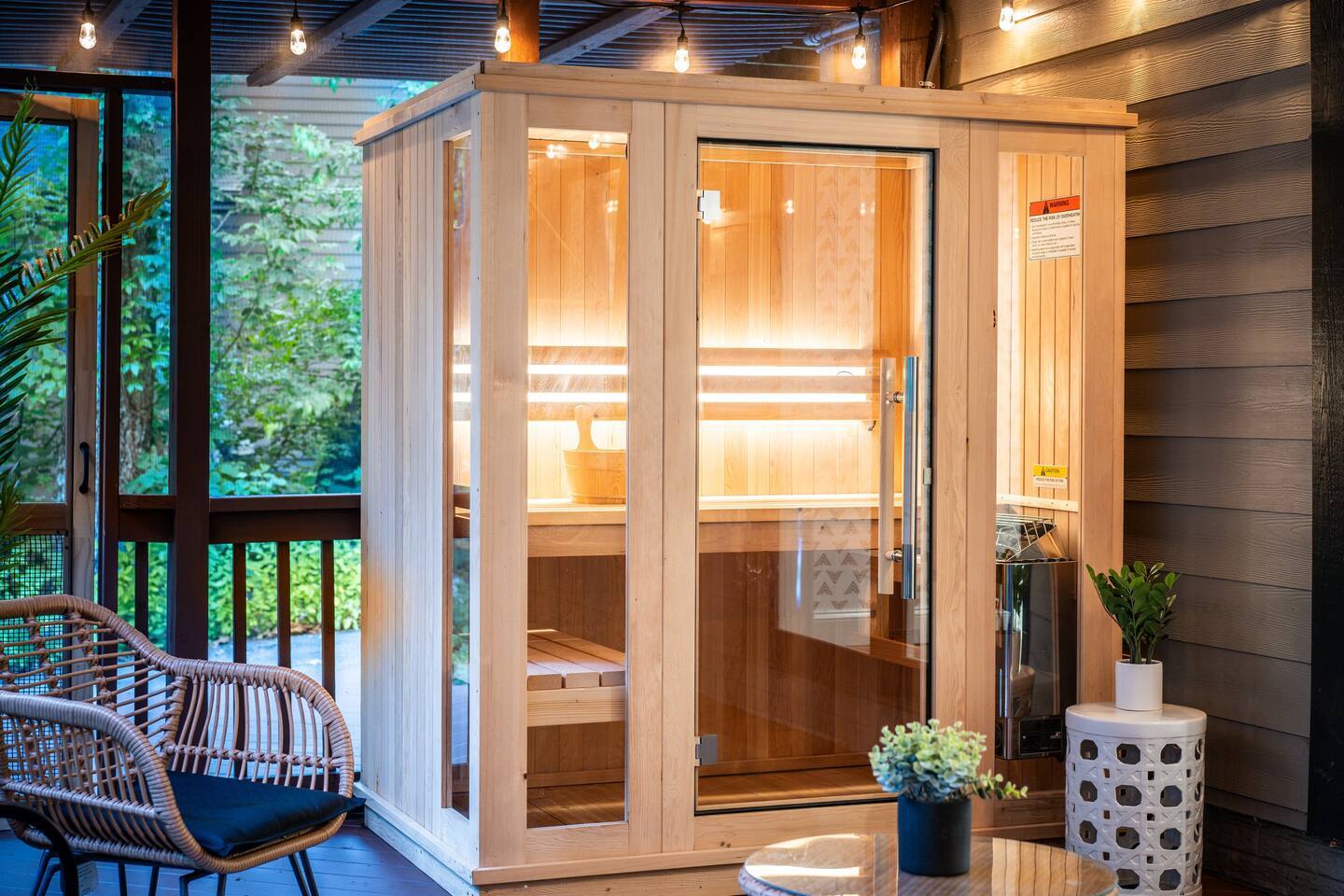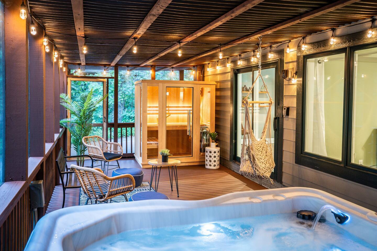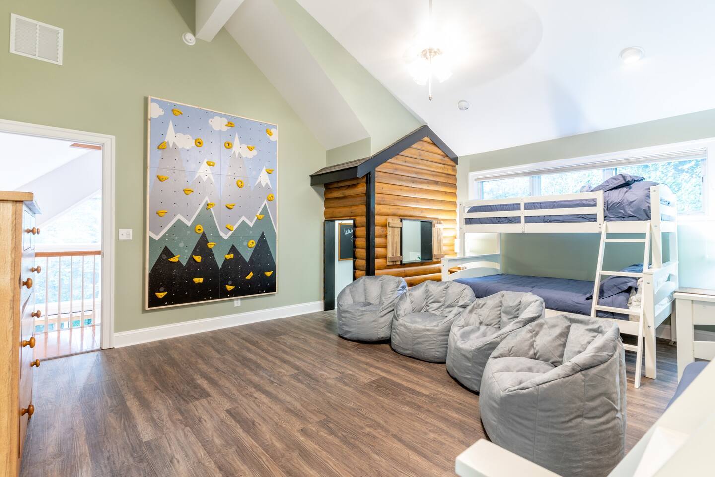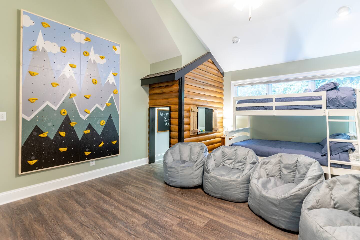 Welcome to Sutton's Roost, a designer-decorated home in the heart of Wintergreen. A perfect spot for groups or families, this home boasts a hot tub, outdoor cedar sauna, and multiple outdoor seating areas. Inside, there are upscale living rooms upstairs and downstairs, plus a bunk room with a custom log cabin closet, climbing wall, and 65" TV. With 5 bedrooms total, plus a downstairs living room with a pull-out sofa, there's plenty of room for up to 16 guests. Plus, pet friendly!